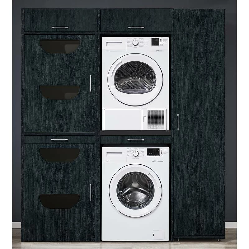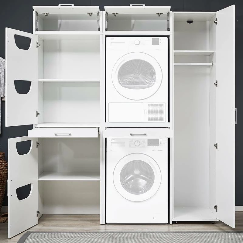 - Ensemble composé de 2 armoires pour machine à laver, 1 colonne de salle de bain, 2 placards à linge et 2 caissons hauts